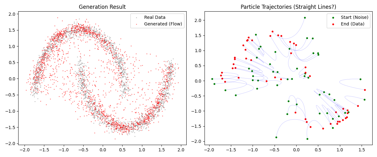第六步:结果可视化 (Visualization) 最后,我们将生成的样本与真实分布对比,并画出粒子移动的轨迹,以验证 Flow Matching 是否成功学习了“直线”路径。